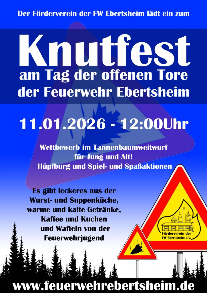 Am Samstag werden wie jedes Jahr von der Feuerwehr Ebertsheim gemeinsam mit der Jugendfeuerwehr die Tannenbäume eingesammelt. Solange kann der Tannenbaumweitwurf noch geübt werden! Denn am Sonntag findet dann das 3. Ebertsheimer Knutfest der Feuerwehr statt! Es gibt wieder Preise in den Einzelwürfen in Männer- und Frauenliga und auch der Wanderpokal in den Gruppenwürfen kann wieder errungen werden!
